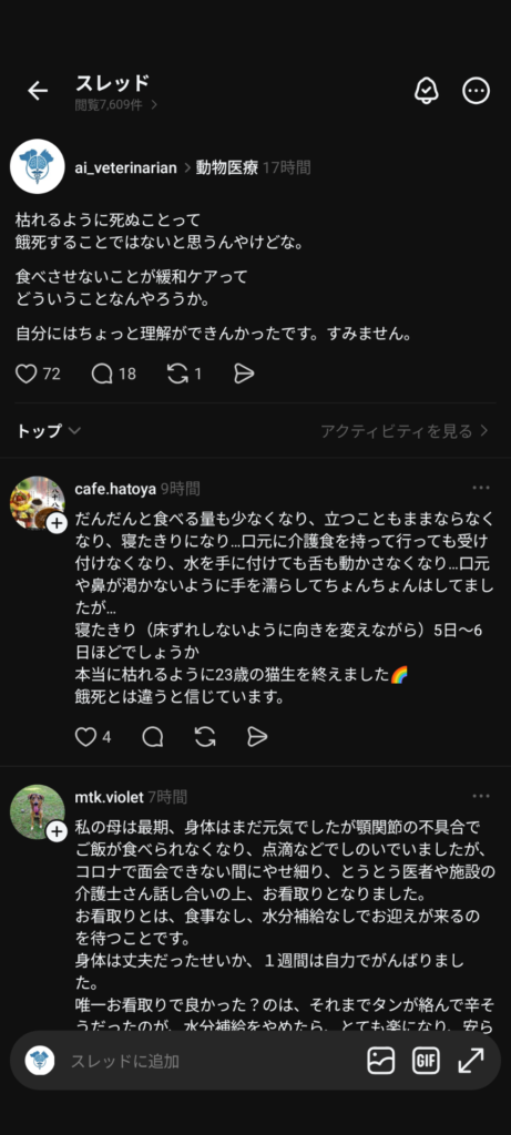 食べさせないで餓死させる方向に持っていく緩和ケアってなんやねんって正直思いました。